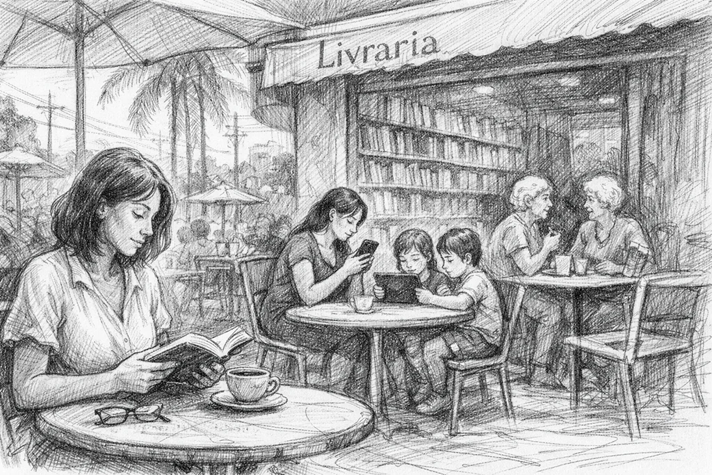 Por que digo isso? Estou em uma área de elite. Um dos bairros mais caros do Rio. E ninguém lê. Não vejo uma viva alma disposta a se acomodar em um canto, fazer silêncio e imergir em um mundo de papel. A moça da mesa da frente mostra com entusiasmo a viagem de sua médica por um país que ela logo identifica. Está radiante ao ver a viagem da outra. Isso basta.